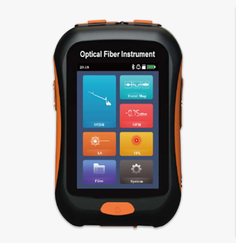Handheld mini OTDR; 1550 nm single-mode; ~20 dB dynamic range; up to 80 km test; touchscreen; VFL; OPM; event map; portable.