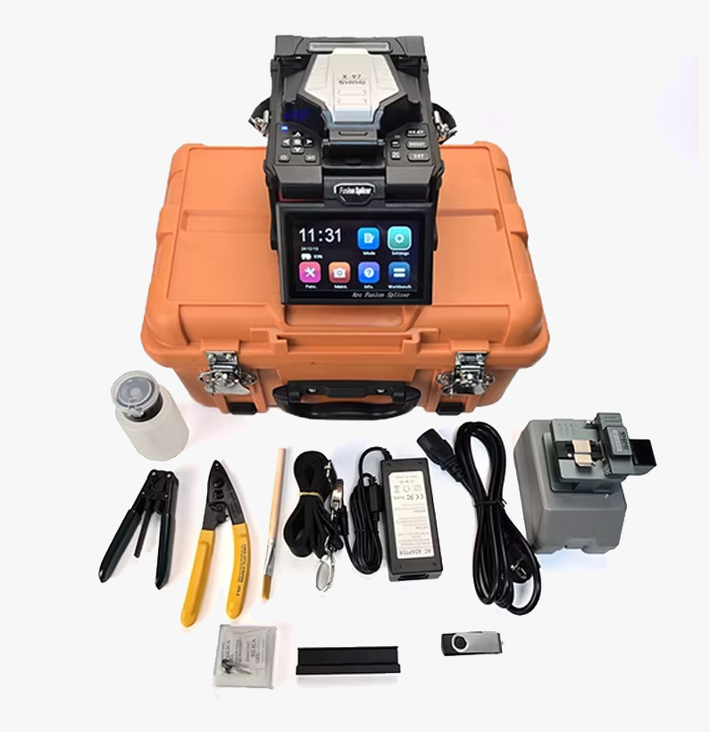 SHINHO X600 fusion splicer, 4-motor core alignment, approximately 7-second splice, 20–26 second heat time, low loss around 0.02 dB, automatic and manual modes, portable handheld design.